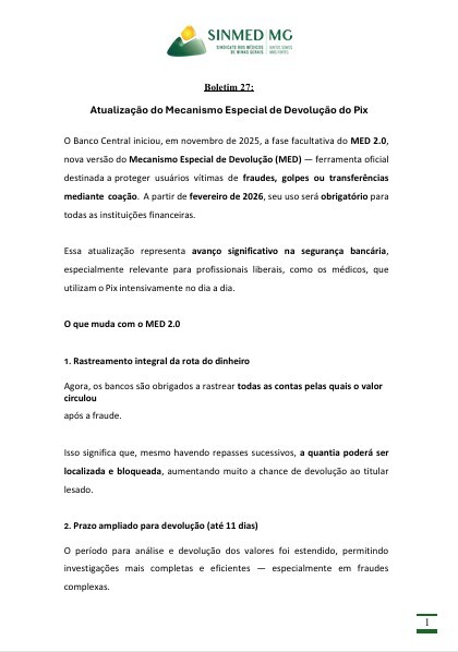 O sistema inclui botão de contestação para agilizar pedidos, mas não cobre erros do usuário nem desacordos comerciais. Profissionais de saúde devem registrar a ocorrência no app do banco, reunir provas e acionar a assessoria jurídica do Sinmed-MG. O MED 2.0 é um avanço importante na proteção financeira de quem utiliza Pix intensivamente.