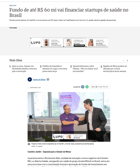 Parceria entre Horizontes Hub e Abertta Saúde segue como destaque na imprensa. Os portais Diário do Comércio, Diário de Sete Lagoas, Executivos da Saúde e Estado de Minas deram destaque à criação do Fundo de Investimento em Participações (FIP) Saúde, que avança após aprovação da Comissão de Valores Mobiliários (CVM), com até R$ 60 milhões para investir em healthtechs e impulsionar inovação no setor nos próximos quatro anos.