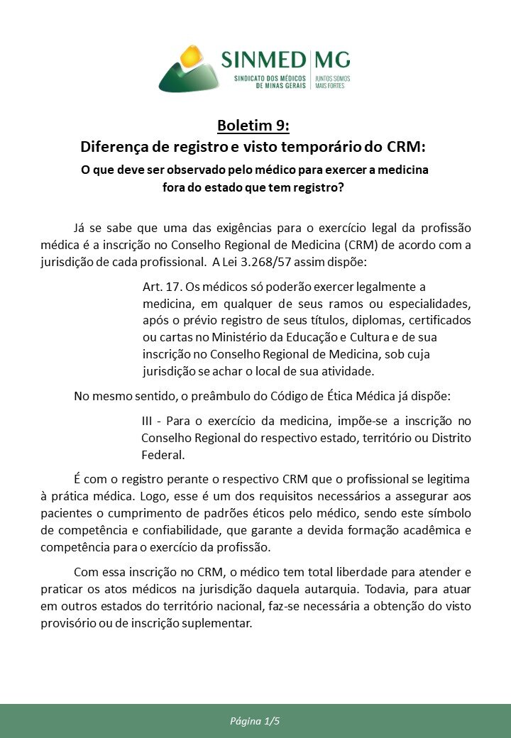 Em mais um Boletim do Sindicato dos Médicos de Minas Gerais (Sinmed), o assessor jurídico da entidade, Daniel Mendes, explica a “Diferença de registro e visto temporário do CRM” e qual se aplica a essa situação.
