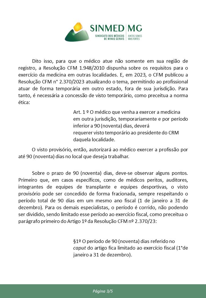 Em 2023, o Conselho Federal de Medicina publicou a Resolução CFM n° 2.370/2023 atualizando o tema, permitindo ao profissional atuar de forma temporária em outro estado, fora de sua jurisdição, sendo necessário, para tal, a concessão de um visto temporário.