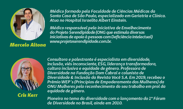 Teremos dois convidados para debater e contribuir com o tema: os palestrantes Marcelo Altona, médico especializado em Geriatria e Clínica do Hospital Israelita Albert Einstein, e a Cris Kerr, consultora e especialista em diversidade.