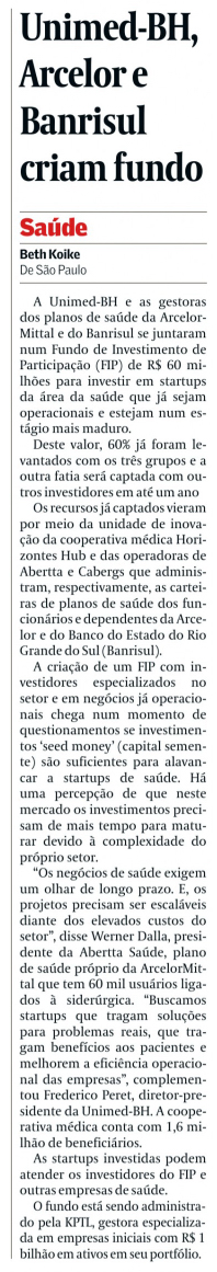 Jornal Valor Econômico noticiou a criação de um Fundo de Investimentos em Participações (FIP), uma parceria da Unimed-BH, por meio do Horizontes Hub, Abertta Saúde, autogestão em saúde do grupo ArcelorMittal no Brasil e outras empresas para investir R$ 60 milhões em startups da área da saúde que já sejam operacionais e estejam num estágio mais maduro.