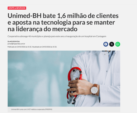 A Unimed-BH apresentou aos cooperados e ao mercado seu Relatório de Gestão 2025. Os excelentes resultados, incluindo o crescimento da receita líquida e o recorde de 1,6 milhão de clientes, ganharam destaque na imprensa com repercussão positiva nos jornais Diário do Comércio, Hoje em Dia, 98 News, Mercado Comum, Blog do PCO, entre outros.