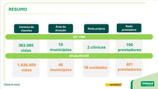 Os parâmetros foram adequados para o contexto de 1999, quando a cooperativa tinha menor porte, menor complexidade operacional e um ambiente regulatório menos exigente. Desde então, a Unimed-BH passou por uma transformação de grande escala: a carteira de clientes evoluiu aproximadamente 4,5 vezes, a área de atuação expandiu-se cerca de 4,6 vezes, a rede própria ampliou de 2 clínicas para 18 unidades e a rede prestadora cresceu aproximadamente 3,8 vezes.
