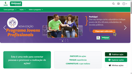 Já soube da novidade? A plataforma do Programa de Voluntariado Unimed-BH está no ar. Um ambiente digital que vai fortalecer a conexão entre os voluntários, trazer ações, notícias, experiências de aprendizado, resultados, além de ampliar o alcance e o impacto das iniciativas sociais.
