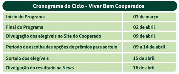 - Cada cooperado poderá escolher apenas um prêmio para participar do sorteio. O benefício é pessoal e intransferível.